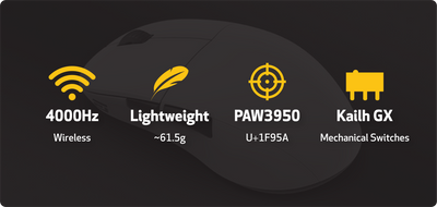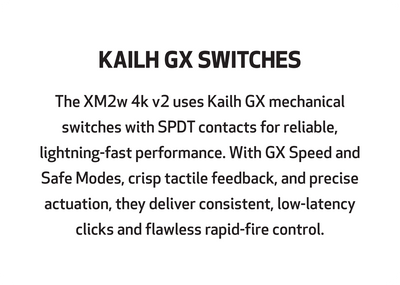 Introducing the XM2w 4k v2 Wireless Gaming Mouse, the upgrade to the highly anticipated high-end wireless XM series. Maintaining the iconic claw-grip shape, this powerhouse boasts an array of internal enhancements, including Endgame Gear's custom PixArt PAW3950 U+1F95A sensor and a Kailh dustproof encoder for improved reliability. Powered by the Nordic nRF52840 MCU and paired with a high polling rate dongle, this mouse delivers unparalleled wireless performance of up to 4000Hz. Experience super crisp and satisfying clicks with the custom-made, pre-sorted Kailh GX SPDT switches for the main buttons, and custom Kailh GM 2.0 for the middle and side buttons.