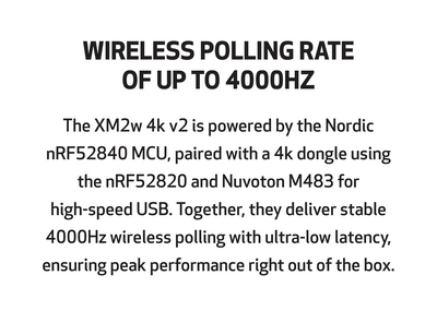 To achieve the best performance possible, XM2w 4k v2 is powered by the Nordic nRF52840 wireless MCU. The 4k dongle utilizes a Nordic nRF52820 to guarantee stable and reliable wireless data transmissions. Additionally, a Nuvoton M483 MCU is used in the dongle for the high-speed USB connection, enabling high wireless polling rates of up to 4000Hz for incredibly low sensor and click latency. The 4k dongle is included with the mouse for ideal performance straight out of the box.