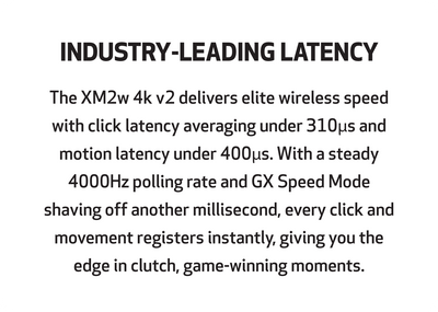 The XM2w 4k v2 raises the bar for wireless performance, boasting click latency averaging below 310 microseconds*. With a steady 4000Hz polling rate for the clicks, you'll enjoy ultra-low click latency across all sensor polling rate options. GX Speed Mode further lowers click latency by about 1ms. This exceptional responsiveness guarantees instant registration of every click, empowering you in crucial gaming moments and helping secure those game-winning duels. Endgame Gear didn't stop there. They've optimized motion latency to an average of under 400 microseconds**, ensuring unmatched responsiveness. Initial motion latency from a standstill remains consistently fast across all polling rate options, reinforcing your gaming advantage.