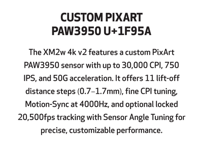 Unlock ultimate precision and lightning-fast response with the custom PixArt PAW3950 U+1F95A sensor in the XM2w 4k v2. With up to 30,000 CPI max resolution, 750 IPS, and 50G acceleration, every movement is captured with raw accuracy and maximum impact. Fine-tune your setup with 11 Lift-Off-Distance steps from 0.7 to 1.7mm, and precise 10-point CPI adjustments below 10,000 CPI for complete control. No smoothing, no angle-snapping – just pure, uncompromised performance. Motion-Sync delivers consistently timed reports at polling rates up to 4000Hz, sharpening your muscle memory and perfecting competitive gameplay.