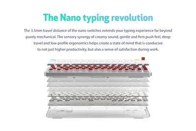 Typing on Air75 with Nano switches feels like running on a hardwood court in a pair of luxury trainers, the upstroke follows your fingertip smoothly and effortlessly as the downstroke, leaving behind a trail of satisfying, creamy ASMR clacks.
