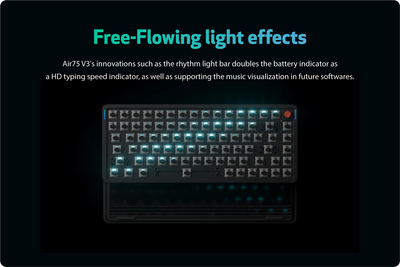 The Air75 V3 features per-key RGB with 21+ effects, adjustable brightness and speed, and a new rhythm light bar that functions as both a battery indicator and a high-definition typing-speed display, with planned support for music visualization.