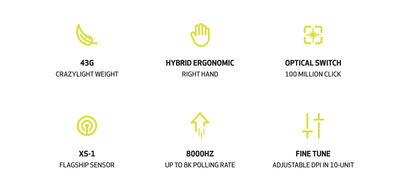 The X3 CrazyLight is an ultra-lightweight gaming mouse, boasting an astonishing 43g weight. It offers a unique hybrid ergonomic design that combines the best of symmetrical and asymmetrical shapes. Its extreme lightness reduces wrist fatigue during extended play sessions, while the 8K polling rate favored by gamers ensures swift, accurate, and responsive actions. Featuring the advanced XS-1 sensor, it supports up to 32,000 DPI, 750 IPS tracking, and 50g acceleration for precise control. Durable optical switches, rated for 100 million clicks, add to its reliability. Combining ultra-lightweight design with top-tier performance, the CrazyLight delivers an exceptional gaming experience tailored to every player.