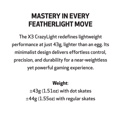 X3 CrazyLight gaming mouse redefines what it means to be lightweight, weighing an incredible 43g lighter than an actual egg. Its minimalist design ensures ultra-light handling while delivering cutting edge functionality for peak performance. Despite its feather-light build, it boasts exceptional durability and sleek aesthetics. Elevate your gaming experience with a mouse that feels nearly weightless but delivers heavyweight results.