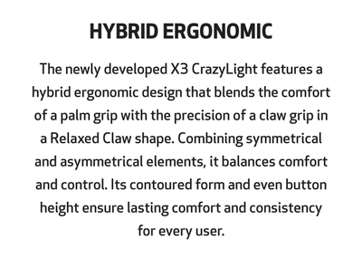 The newly developed X3 CrazyLight mouse features a hybrid ergonomic design that combines the best of palm grip and claw grip into a Relaxed Claw shape. By merging the advantages of symmetrical and asymmetrical designs, it achieves a perfect balance of comfort and control. The symmetrical button height ensures a consistent experience for all users, while the asymmetrical shape contours naturally to the hand, providing exceptional comfort even during extended gaming sessions.