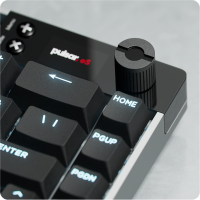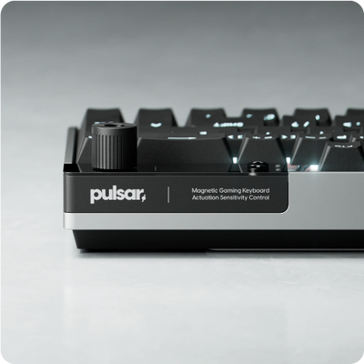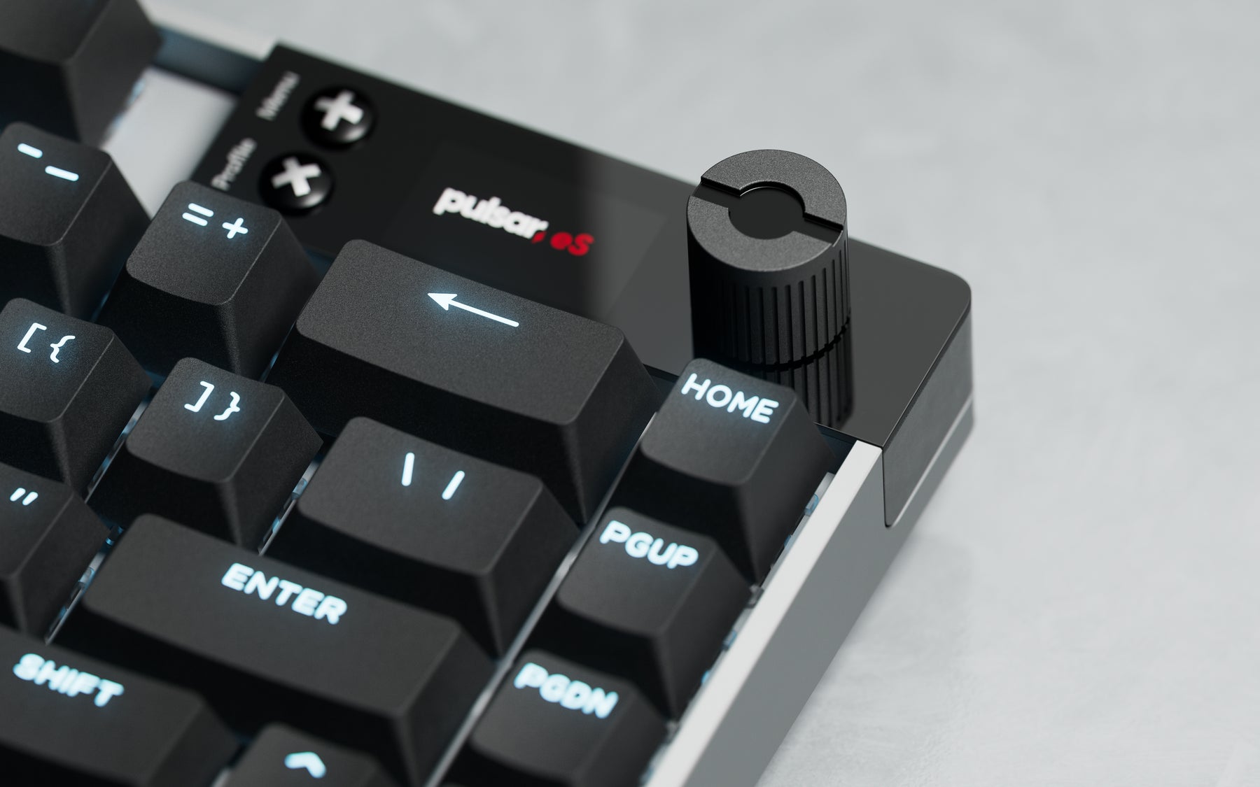 The compact 70% layout PULSAR ES HE 70 keyboard features a built-in LCD display and an adjustable knob, allowing users to customize functions directly on the keyboard without installing any software. Through the intuitive screen, you can easily configure actuation point, DKS, rapid trigger, macros, and more. It features magnetic switches and vivid RGB effects for enhanced responsiveness and immersion. With a dedicated profile button on top, you can quickly switch between four onboard profiles. Directional arrow keys are also included to eliminate the usual limitations of mini keyboards. These features make it an exceptional choice for gaming.