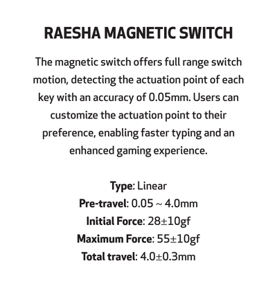 The magnetic switch offers full range switch motion, detecting the actuation point of each key with an accuracy of 0.05mm. Users can customize the actuation point to their preference, enabling faster typing and an enhanced gaming experience.