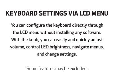 You can configure the keyboard directly through the LCD menu without installing any software. With the knob, you can easily and quickly adjust volume, control LED brightness, navigate menus, and change settings.