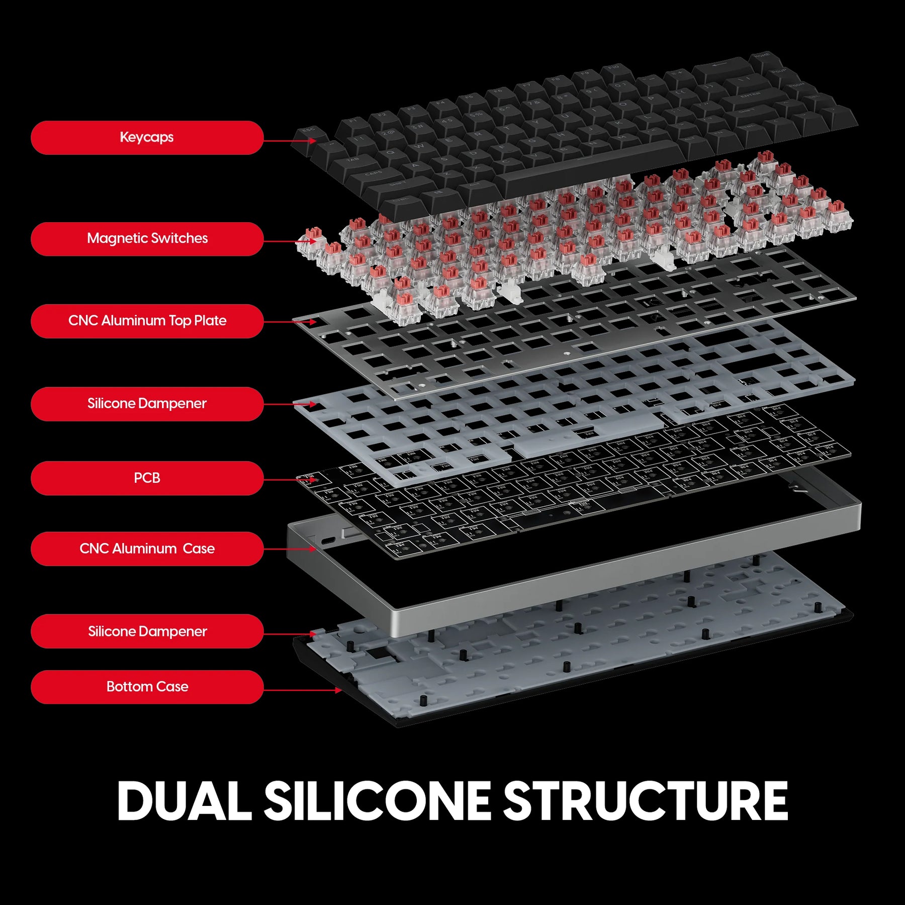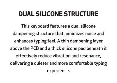 This keyboard features a dual silicone dampening structure that minimizes noise and enhances typing feel. A thin dampening layer above the PCB and a thick silicone pad beneath it effectively reduce vibration and resonance, delivering a quieter and more comfortable typing experience.