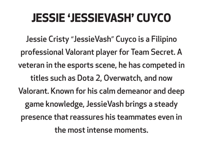 Jessie Cristy “JessieVash” Cuyco is a Filipino professional Valorant player for Team Secret. A veteran in the esports scene, he has competed in titles such as Dota 2, Overwatch, and now Valorant. Known for his calm demeanor and deep game knowledge, JessieVash brings a steady presence that reassures his teammates even in the most intense moments.