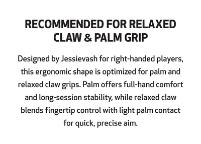Designed by Jessievash, this ergonomic shape is tailored specifically for right-handed users, based on his personal grip style. It is optimized for palm grip and relaxed claw grip. The palm grip supports the entire hand on the mouse, providing comfort and stability for long sessions and broad movements. The relaxed claw grip combines fingertip control with light palm contact, allowing for quick reactions and precise aim. Experience the precision and comfort trusted by Jessievash himself.