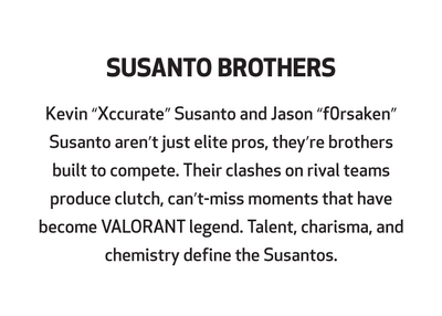 Kevin “Xccurate” Susanto and Jason “f0rsaken” Susanto aren’t just elite esports pros — they’re brothers born to compete. From clutch plays to unforgettable showdowns, especially when facing off on rival teams, their sibling rivalry has become legendary in the VALORANT scene. With unmatched synergy, charisma, and pure talent, the Susanto brothers represent the spirit of competitive excellence and brotherhood.