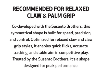 Co-developed with the Susanto Brothers, this symmetrical shape is built for speed, precision, and control. Optimized for relaxed claw and claw grip styles, it enables quick flicks, accurate tracking, and stable aim in competitive play. Trusted by the Susanto Brothers, it's a shape designed for peak performance.