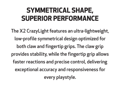 The X2 CrazyLight mouse, designed with an ultra-lightweight structure, features a low-profile, wide symmetrical shape that supports both claw and fingertip grips. The claw grip ensures a stable hold, while the fingertip grip minimizes wrist movement, allowing for quick reactions and precise control. Both grip styles offer exceptional responsiveness and accuracy, providing optimal control tailored to your unique grip preference.