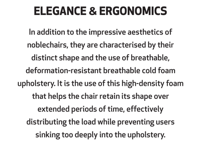 In addition to the impressive aesthetics of Noblechairs, they are characterised by their distinct shape and the use of breathable, deformation-resistant breathable cold foam upholstery. It is the use of this high-density foam that helps the chair retain its shape over extended periods of time, effectively distributing the load while preventing users sinking too deeply into the upholstery.