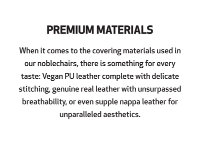 When it comes to the covering materials used in our Noblechairs, there is something for every taste: Vegan PU leather complete with delicate stitching, genuine real leather with unsurpassed breathability, or even supple nappa leather for unparalleled aesthetics.