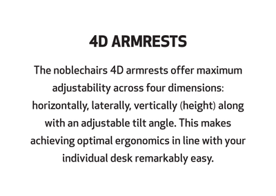 The Noblechairs 4D armrests offer maximum adjustability across four dimensions: horizontally, laterally, vertically (height) along with an adjustable tilt angle. This makes achieving optimal ergonomics in line with your individual desk remarkably easy.