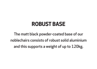 The matt black powder-coated base of our noblechairs consists of robust solid aluminium and this supports a weight of up to 120kg.