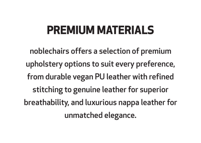When it comes to the covering materials used in our Noblechairs, there is something for every taste: Vegan PU leather complete with delicate stitching, genuine real leather with unsurpassed breathability, or even supple nappa leather for unparalleled aesthetics.