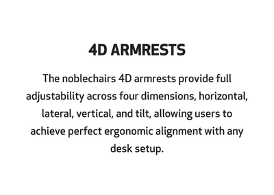 The Noblechairs 4D armrests offer maximum adjustability across four dimensions: horizontally, laterally, vertically (height) along with an adjustable tilt angle. This makes achieving optimal ergonomics in line with your individual desk remarkably easy.