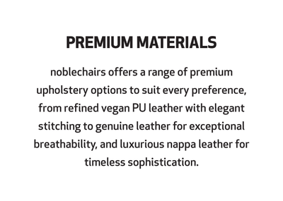 When it comes to the covering materials used in noblechairs, there is something for every taste: Vegan PU leather complete with delicate stitching, genuine real leather with unsurpassed breathability, or even supple nappa leather for unparalleled aesthetics.