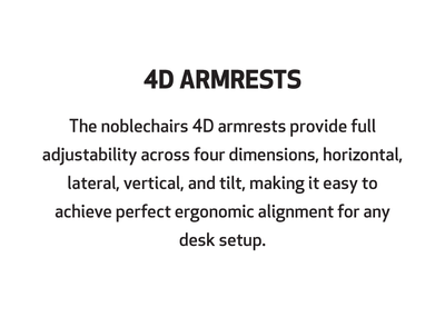 The noblechairs 4D armrests offer maximum adjustability across four dimensions: horizontally, laterally, vertically (height) along with an adjustable tilt angle. This makes achieving optimal ergonomics in line with your individual desk remarkably easy.